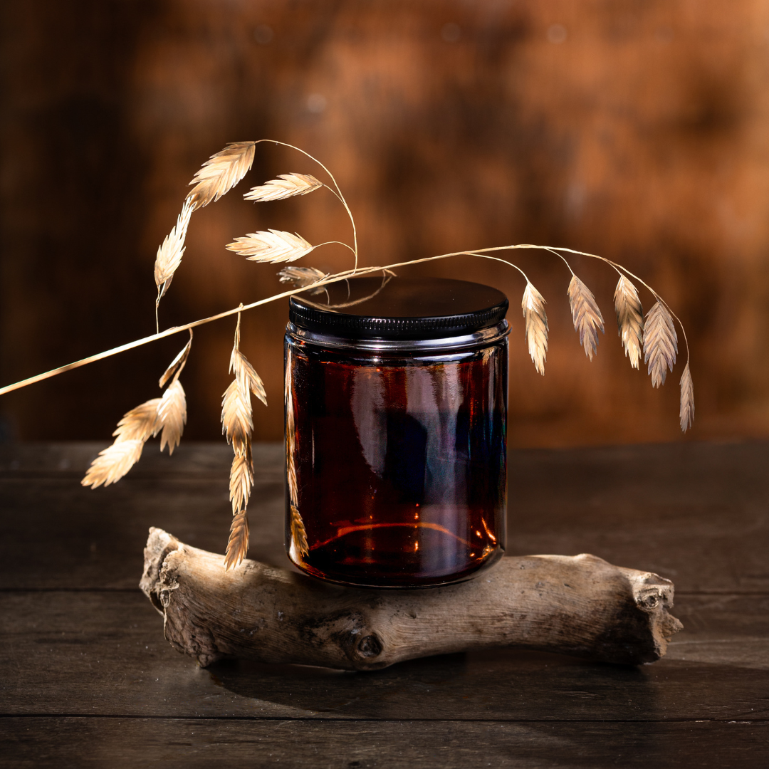 A classic 8oz straight-sided amber glass jar with a sleek all black metal lid, for candle and skincare making.